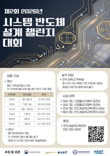 녕하세요. 반도체설계교육센터(IDEC)에서 전국 대학교 학부생을 대상으로, ‘제2회 시스템 반도체 설계 챌린지 대회’를 개최합니다. 이번 대회는 전국 6개 IDEC 지역센터에서 진행되는 예선을 거쳐, 12월 22일(화) 대전 본센터(KAIST)에서 본선 대회를 진행합니다. 대상 및 금상 수상팀에게는 산업통상자원부 장관상이 수여되오니, 학생분들의 많은 관심과 참여를 부탁드립니다. 행사에 대한 상세 내용은 아래를 참고해 주시기 바랍니다. 제2회 2026년 시스템 반도체 설계 챌린지 대회 개요