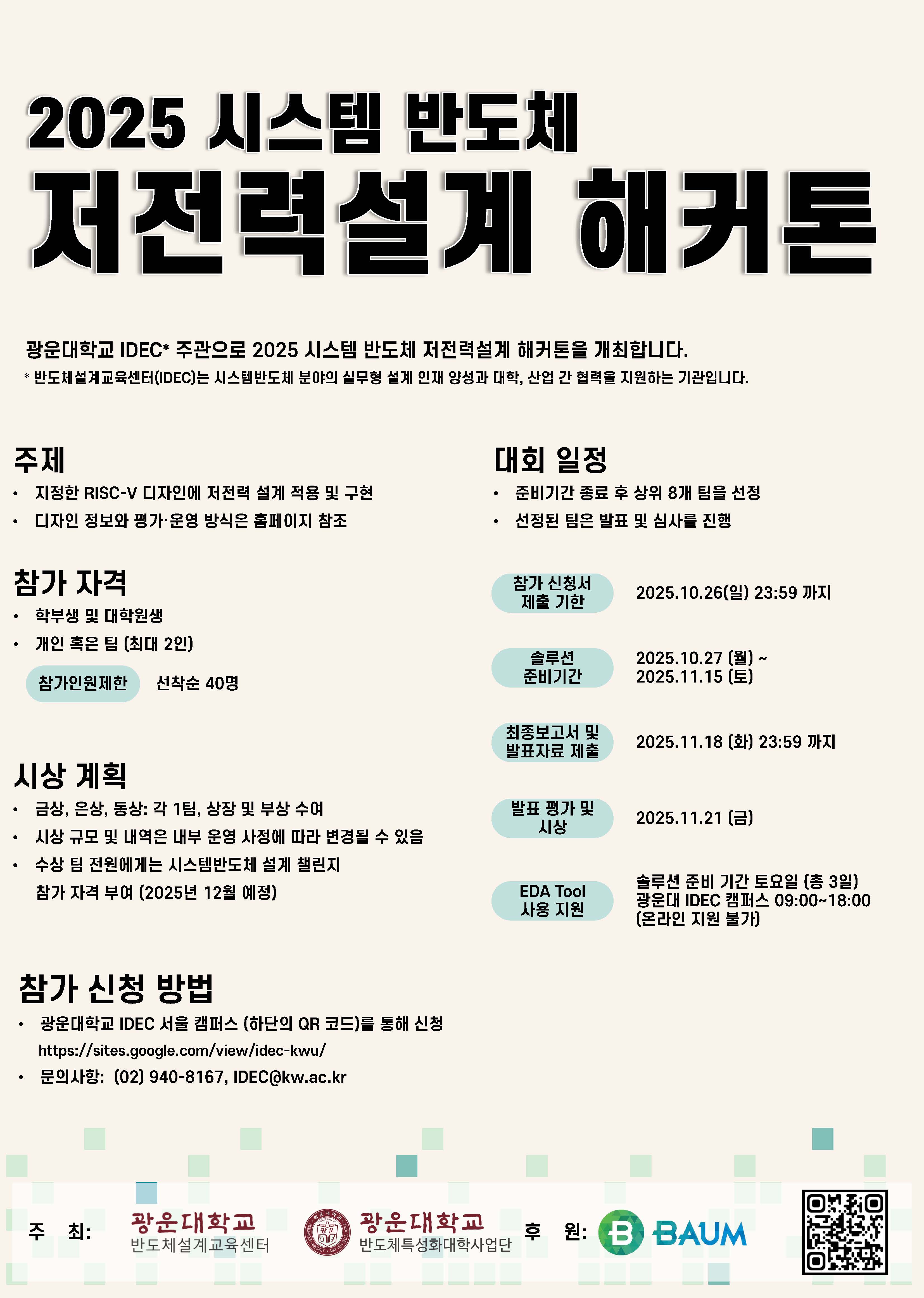 안녕하세요. 광운대학교 IDEC 캠퍼스에서 아래와 같이 "2025 시스템 반도체 저전력설계 해커톤"대회를 개최합니다. 많은 분들은 관심과 참여를 부탁드립니다.