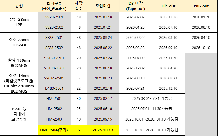 - 회차 표기 방법 변경 : “공정코드-년도모집순서”(예시)삼성28nm LPP 2025년 1회차 : SS28-2501)