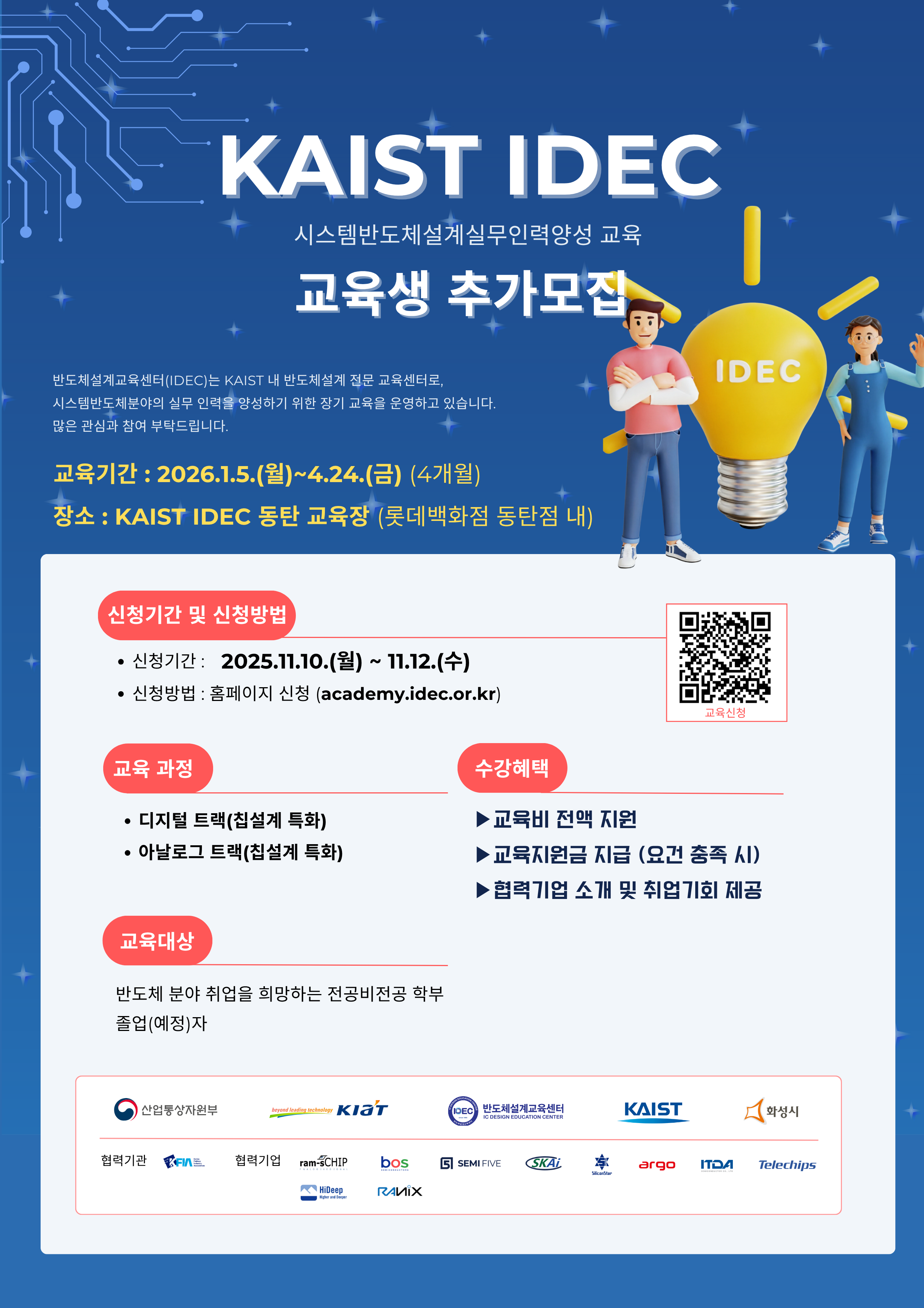 IDEC에서 제11기 시스템반도체설계실무인력양성 교육생을 추가모집합니다. 자세한 내용은 아래를 참고해주시기 바라며, 많은 관심과 참여를 부탁드립니다.