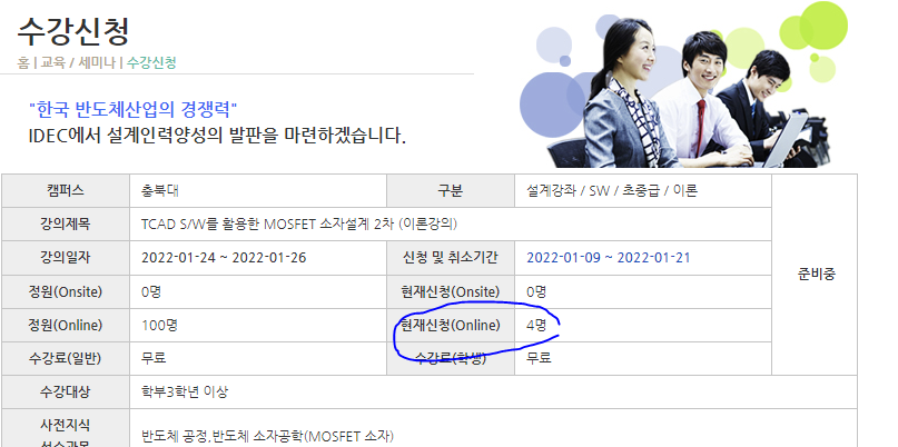 [충북대] TCAD S/W를 활용한 MOSFET 소자설계 2차 (이론강의)에서 현재신청(online) : 4명은 무엇인가요?? 2022.01.06. 15:47