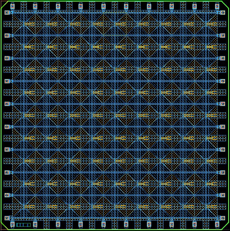 IP명 W-band 2D phase shifter array Category Analog Application W-band 2D phase shifter array 실설계면적 4㎛ X 4㎛ 공급 전압 1.5V IP유형 동작속도 95000000000Hz 검증단계 Simulation 참여공정 SS065-2002 IP개요 W-band 도파관 내부 HE11 모드 진행을 위한 2D 배열 위상 변환기 - 레이아웃 사진 -